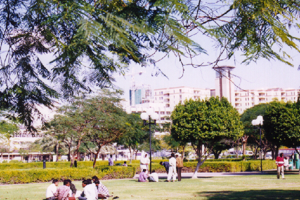ドバイの夏は気温が50度をこえる日もあり,とても外で長い時間をすごすことはできません。しかし,11月ころになると,最高気温が35度くらいになり,すずしさを感じることができるようになります。このころから,公園や街路樹の下の芝生の上で,話をしたり,お弁当を食べてくつろぐ人々が多くなってきます。