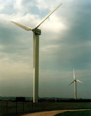 イギリスの西の海岸ぞいに広がるコーンウォール地方でよく見られる風力発電の設備です。一年間を通して西からの風(偏西風)がいつもふいている地方で,そのエネルギーを有効に活用しています。広い荒野に白い巨大な風車がたくさん立っている風景を見ることができます。