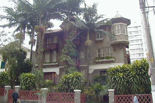 サンパウロ市のパウリスタ大通りに近いジャルジン・パウリスタ地区にのこっている古い家です。現在も人が住んで使っています。コーヒー景気にわいていたころ,コーヒー地主たちがパウリスタ大通りに大きな屋敷をかまえ,宮殿のような石づくりのりっぱな家に住んでいました。ちょっと横に入ったあたりには,石畳の道をはさんで,石づくりのこのような家がならんでいたことでしょう。皇帝椰子が雰囲気をかもし出しています。